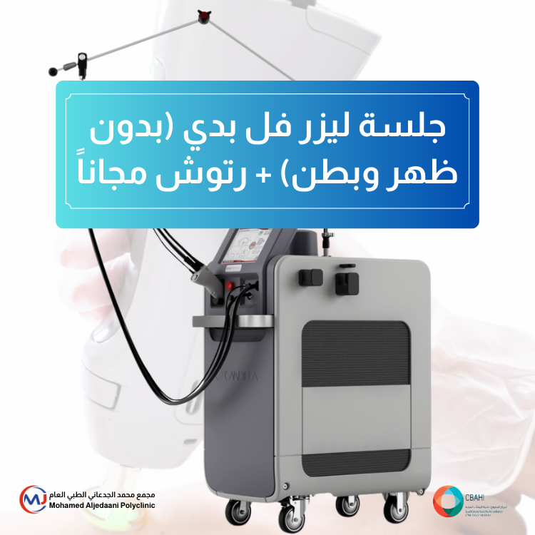 جلسة إزالة شعر شاملة لجميع مناطق الجسم عدا الظهر والبطن، باستخدام جهاز ليزر فعّال يناسب جميع أنواع البشرة، مع أعلى معايير الأمان ونتائج ملموسة من أول جلسة.