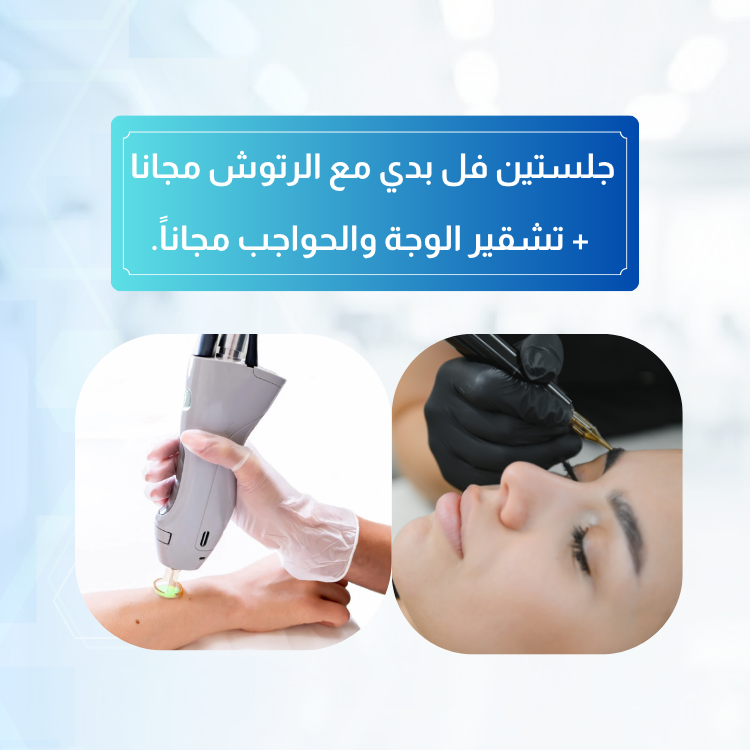استمتعي بجلستي ليزر كامل الجسم لإزالة الشعر بفعالية وراحة عالية، مع توفير خدمة الرتوش مجانًا لضمان أفضل النتائج، بالإضافة إلى تشقير الوجه والحواجب لإطلالة ناعمة ومشرقة. جلسة متكاملة للعناية بجمالك في مكان واحد وبأفضل الأسعار.